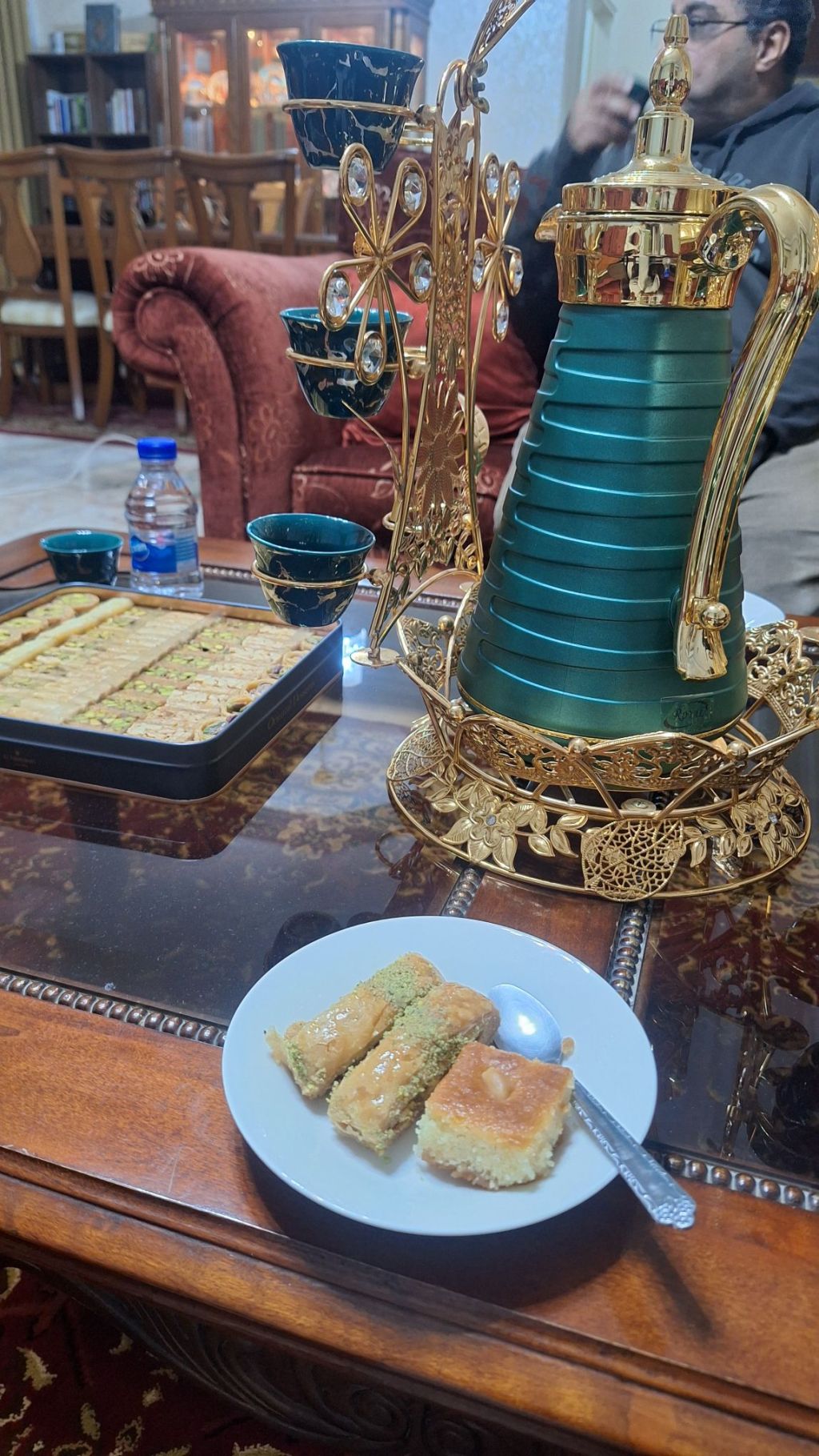 Na de mansaf schonk Kefah ons thee in – stroperig, mierzoet, dampend in kleine glazen. De salontafel vol met nog zoetere gebakjes.