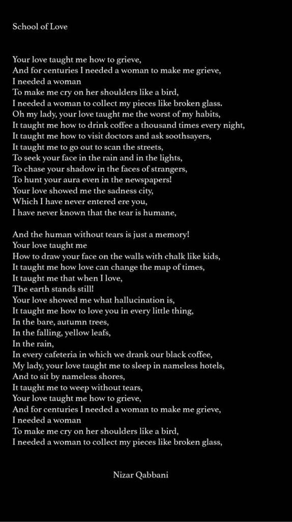 Een half jaar geleden ontdekte ik de Arabische poëzie en deze poëzie voldoet aan alles wat ik zoek in een gedicht. Ze brengt tranen in mijn ogen omdat ik de emoties van de dichter tot in het diepst van mijn wezen voel.